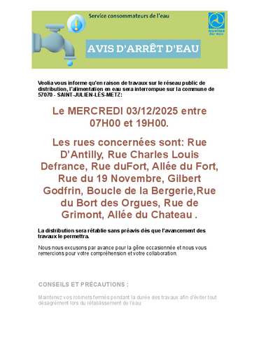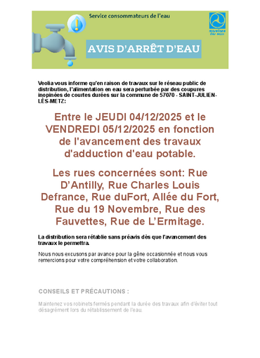 Perturbation sur réseau d'eau jeudi 04 et vendredi 05 décembre